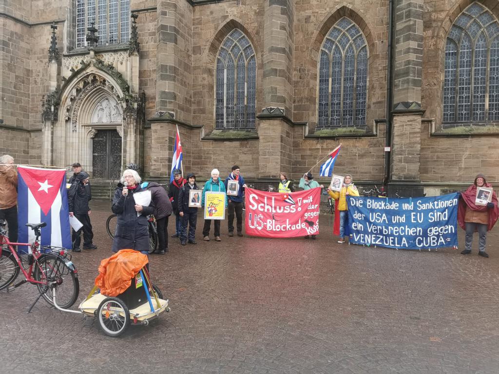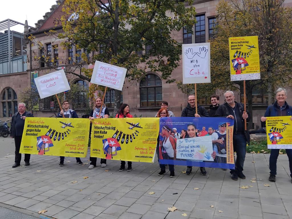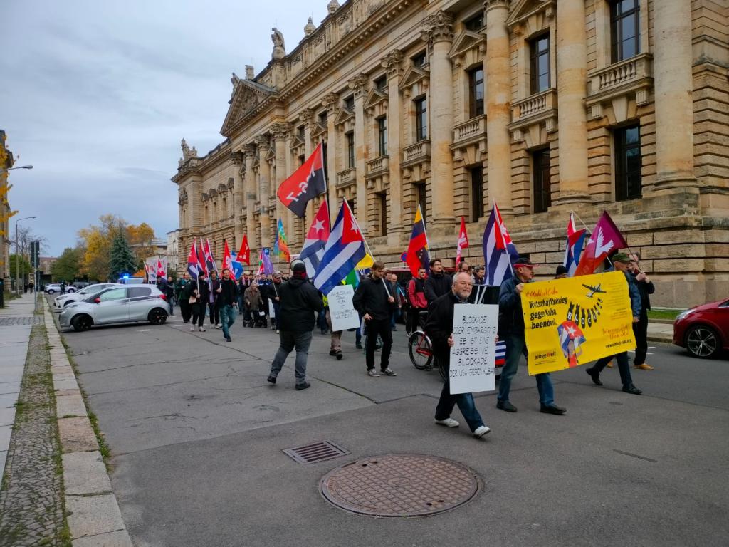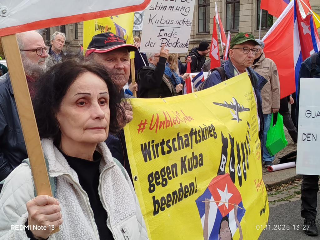 Berlín, 3 de noviembre de 2025.- El sábado 1 de noviembre varias organizaciones del movimiento de solidaridad con Cuba protagonizaron manifestaciones de denuncia y condena al bloqueo económico comercial y financiero que impone el gobierno de Estados Unidos a Cuba. Los participantes, reunidos ante el consulado estadounidense en Leipzig, así como en céntricas plazas de Núremberg y Bremen, exigieron que Estados Unidos respete la decisión de la Comunidad Internacional expresada en la reciente votación en la Asamblea General de las Naciones Unidas, donde 165 países votaron a favor del cese inmediato de esta política de guerra económica contra Cuba.