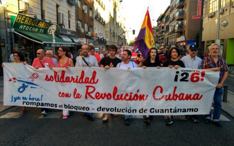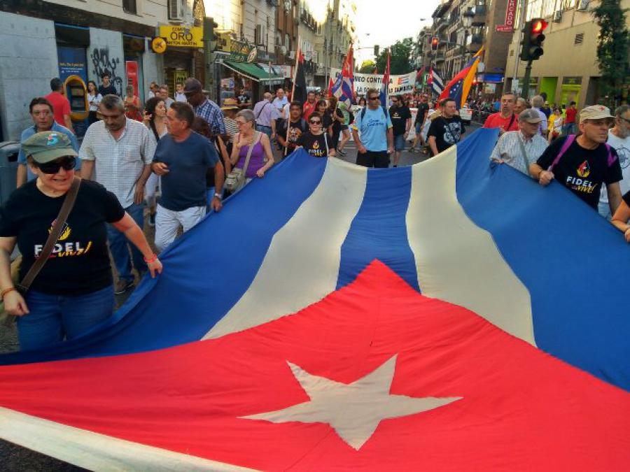 Alrededor de 600 personas recorrieron el centro de la ciudad desde la calle Atocha hasta la Puerta del Sol, coreando consigas de apoyo a Cuba y Venezuela, recordando al Comandante en Jefe Fidel Castro, exigiendo el fin del bloqueo de Estados Unidos contra Cuba y la devolución del territorio ocupado ilegalmente Guantánamo, así como expresando rechazo las medidas anunciadas por la actual administración norteamericana.