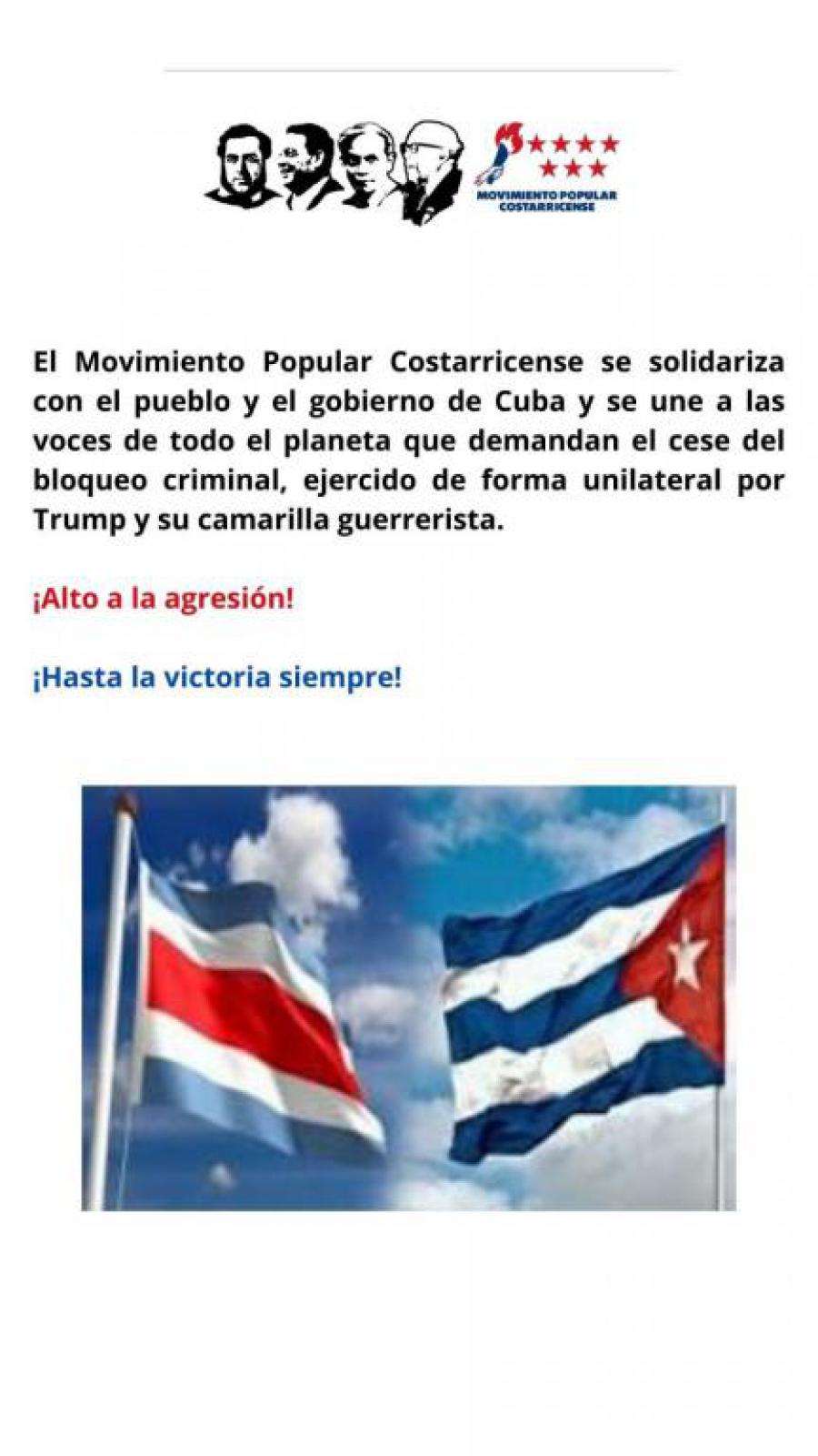 El Movimiento Popular Costarricense se solidariza con el pueblo y el gobierno de Cuba y se une a las voces de todo el planeta que demandan el cese del bloqueo criminal, ejercido de forma unilateral por Trump y su camarilla guerrerista