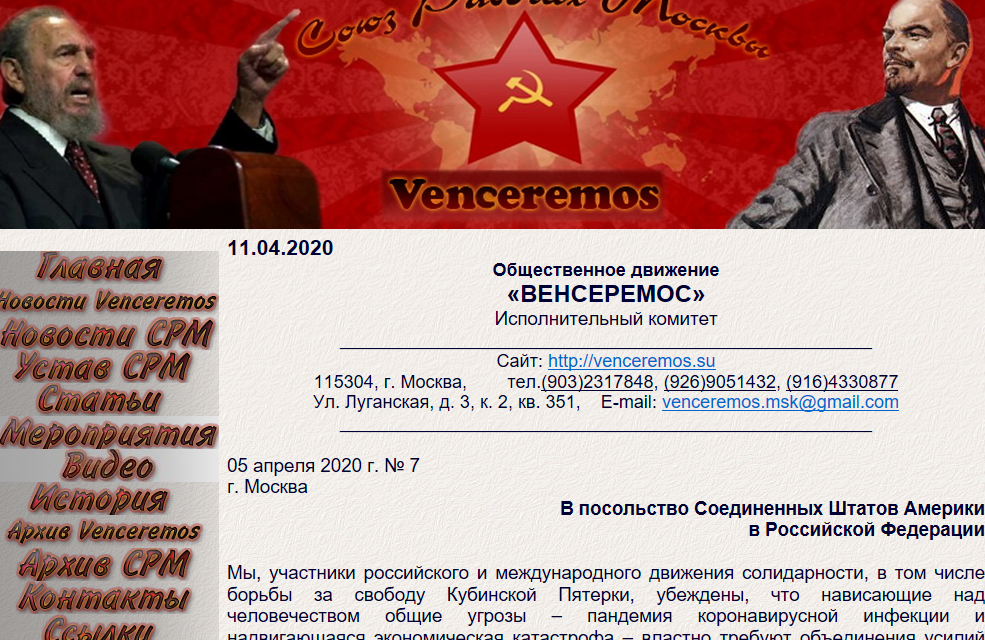 Moscú, 12 de abril-. Integrantes del Movimiento Social “Venceremos” y su Comité Ejecutivo enviaron una misiva dirigida al gobierno de EE.UU exigiendo el cese del criminal bloqueo económico, comercial y financiero de ese país contra Cuba.