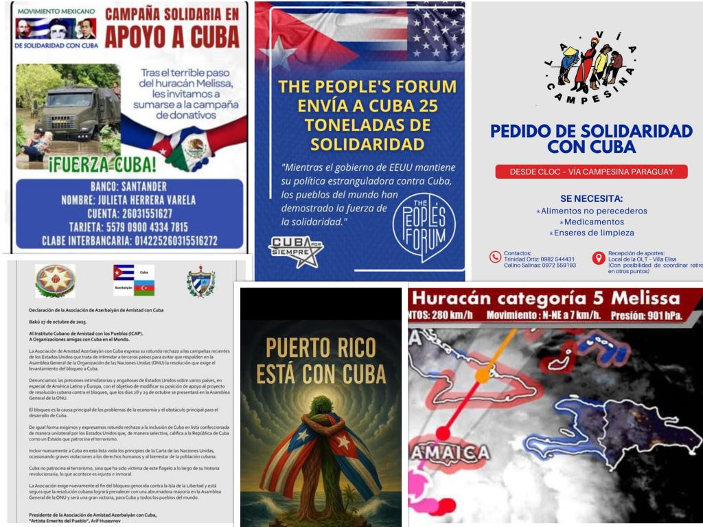 La Habana, Cuba. Ante los cuantiosos daños materiales causados al paso del Huracán Melissa por el Caribe, adicional a la ayuda entregada por varios gobiernos y diversas agencias de la ONU, el movimiento solidario mundial se ha movilizado para hacer donaciones y enviar asistencia humanitaria a las provincias orientales cubanas afectadas. Hasta la fecha se registran organizaciones de Paraguay, Puerto Rico, México, Vietnam y EE.UU.