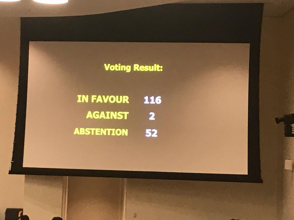 El texto, que reconoce que las medidas económicas coercitivas unilaterales constituyen una flagrante violación de los principios del Derecho Internacional y la Carta de las Naciones Unidas, fue adoptado por 116 votos a favor, 2 (EEUU e Israel) en contra y 52 abstenciones.