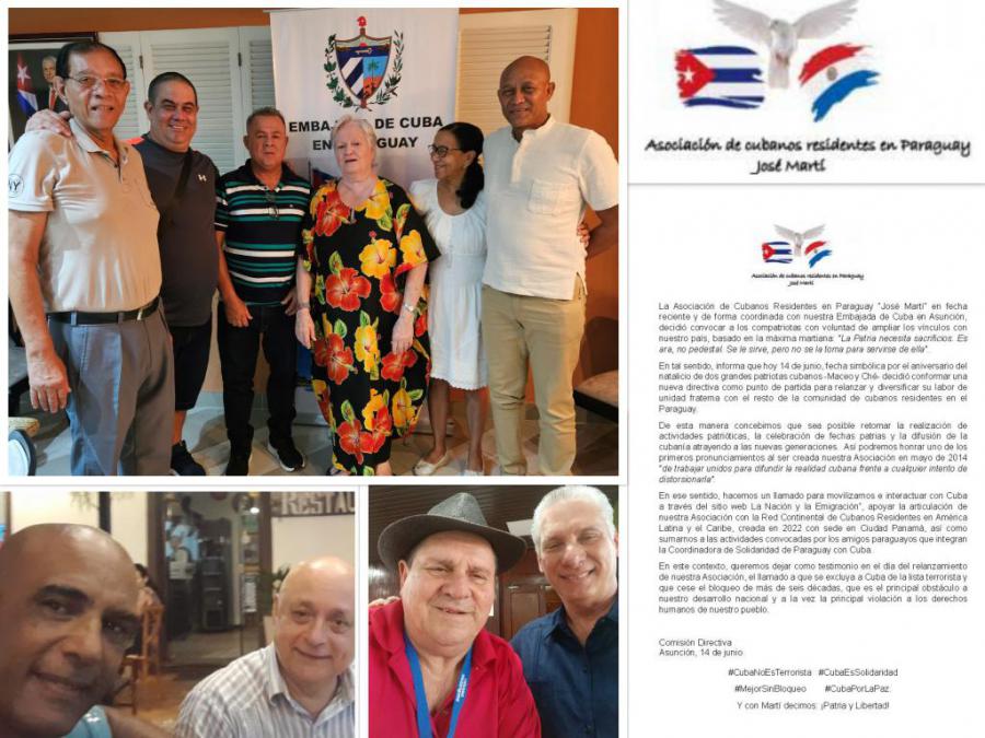 Asunción, 14 de junio de 2024. La Asociación de Cubanos Residentes en Paraguay “José Martí”, de forma coordinada con la Embajada de Cuba en Asunción, decidió convocar a los compatriotas con voluntad de ampliar los vínculos con nuestro país, basado en la máxima martiana: “La Patria necesita sacrificios. Es ara, no pedestal. Se le sirve, pero no se la toma para servirse de ella”. En tal sentido, informa que hoy 14 de junio, fecha simbólica por el aniversario del natalicio de dos grandes patriotas cubanos -Maceo y Ché- decidió conformar una nueva directiva como punto de partida para relanzar y diversificar su labor de unidad fraterna con el resto de la comunidad de cubanos residentes en el Paraguay.
