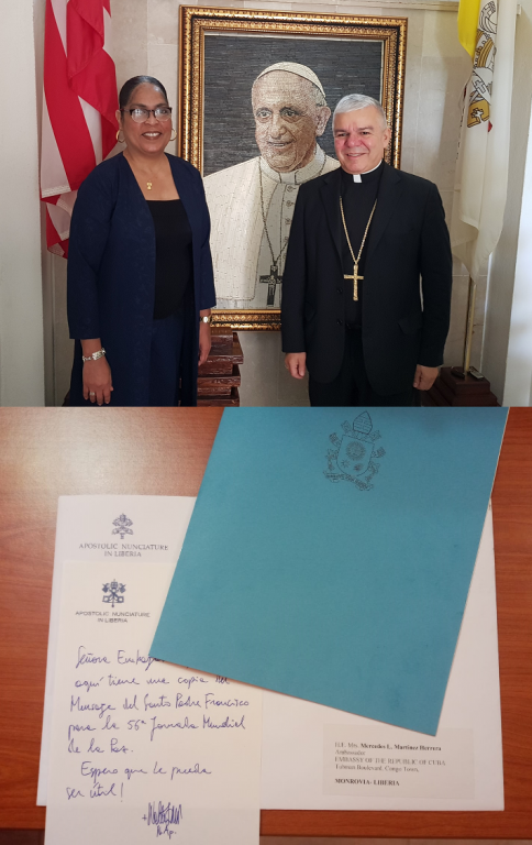 Monrovia, 16 de enero, 2023.- En ocasión del aniversario 25 de la visita pastoral de Su Santidad Juan Pablo II a Cuba, el Nuncio Apostólico en Liberia S.E. Walter Erbì tuvo la gentileza de obsequiar a la Jefa de Misión cubana Mercedes L. Martínez Herrera, un ejemplar del Mensaje del Papa Francisco para la 56 Jornada Mundial de la Paz.