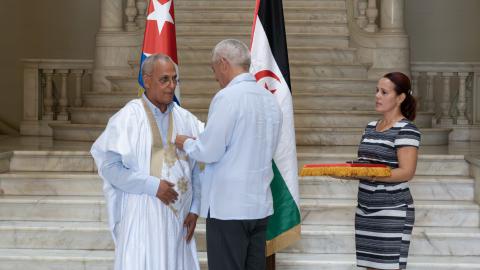 La Habana, 23 de septiembre de 2025.- El embajador de la República Árabe Saharaui Democrática en Cuba, compañero Mohamed Salec Abdesamad, recibió la Medalla de la Amistad en la sede de la Cancillería cubana de manos del ministro interino de Relaciones Exteriores, Gerardo Peñalver Portal.