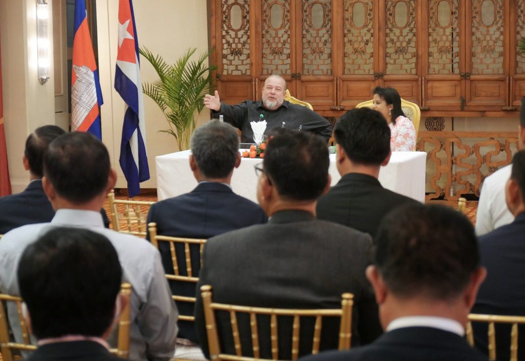 Acompañado por la embajadora de Cuba en Cambodia, Luirka Rodríguez Barrios, y los demás miembros de la delegación cubana, Marrero Cruz ofreció una actualización sobre la situación económica del país, y las medidas implementadas para salir adelante.