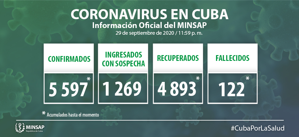- Ciudadana cubana de 5 años de edad, residente en el municipio Sancti Spíritus, provincia del mismo nombre. Contacto de caso confirmado anteriormente. Se mantienen en vigilancia 6 contactos.