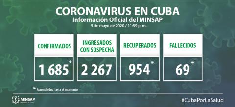 Parte de cierre del día 4 de mayo a las 12 de la noche Al cierre del día de ayer, 4 de mayo, se encuentran ingresados en hospitales para vigilancia clínico epidemiológica 2 mil 267 pacientes. Otras 6 mil 47 personas se vigilan en sus hogares, desde la Atención Primaria de Salud. Para COVID-19 se estudiaron 2 mil 169 muestras, resultando 17 muestras positivas. El país acumula 57 mil 711 muestras realizadas y mil 685 positivas (2,9%). Por tanto, al cierre del día de ayer se confirman 17 nuevos casos, para un acumulado de mil 685 en el país. Los 17 nuevos casos confirmados fueron cubanos. De ellos, 10 (58,8%) fueron contactos de casos confirmados y en 7 (41,1%) no se precisa la fuente de infección. De los 17 casos diagnosticados, 10 (58,8%) fueron mujeres y hombres 7 (41,2%). Los grupos de edades más afectados fueron: los de 40 a 60 años con 7 casos (41%), seguido de los de más de 60 años con 6 (35,3%). El 47,1% (8) de los casos positivos fueron asintomáticos. La residencia por provincias y municipios de los 17 casos confirmados es: La Habana: 9 casos (2 del municipio San Miguel del Padrón, los municipios Centro Habana Arroyo Naranjo, Habana Vieja, Plaza, Cotorro, La Lisa y Diez de Octubre con 1 cada uno) Mayabeque: 1 caso (1 caso del municipio San José de las Lajas) Matanzas: 1 caso (1 del municipio Cárdenas) Villa Clara: 2 casos (1 del municipio Santa Clara; 1 del municipio Camajuaní) Sancti Spíritus: 1 caso (1 del municipio Sancti Spíritus) Camagüey: 1 caso (1 del municipio Camagüey) Holguín: 2 casos (2 del municipio Banes) Detalles de los 17 casos confirmados: La Habana Ciudadana cubana de 16 años de edad, residente en el municipio San Miguel del Padrón, provincia La Habana. Contacto de caso confirmado anteriormente. Se mantiene en vigilancia 12 contactos. Ciudadana cubana de 67 años de edad, residente en el municipio Cotorro, provincia La Habana. Contacto de caso confirmado anteriormente, relacionado al evento del Centro Provincial de Protección Social. Se mantiene en vigilancia 80 contactos. Ciudadano cubano de 23 años de edad, residente en el municipio Centro Habana, provincia La Habana. Contacto de caso confirmado anteriormente. Se mantiene en vigilancia 20 contactos. Ciudadana cubana de 12 años de edad, residente en el municipio Arroyo Naranjo, provincia La Habana. Se investiga la fuente de infección. Se mantiene en vigilancia 13 contactos. Ciudadana cubana de 70 años de edad, residente en el municipio Plaza de la Revolución, provincia La Habana. Contacto de caso confirmado anteriormente. Se mantiene en vigilancia 18 contactos. Ciudadana cubana de 48 años de edad, residente en el municipio Habana Vieja, provincia La Habana. Contacto de caso confirmado anteriormente. Se mantiene en vigilancia 15 contactos. Ciudadana cubana de 51 años de edad, residente en el municipio La Lisa, provincia La Habana. Contacto de caso confirmado anteriormente. Se mantiene en vigilancia 29 contactos. Ciudadana cubana de 51 años de edad, residente en el municipio San Miguel del Padrón, provincia La Habana. Contacto de caso confirmado anteriormente. Se mantiene en vigilancia 16 contactos. Ciudadana cubana de 51 años de edad, residente en el municipio Diez de Octubre, provincia La Habana. Se investiga la fuente de infección. Se mantiene en vigilancia 36 contactos. Mayabeque Ciudadana cubana de 70 años de edad, residente en el municipio San José de las Lajas, provincia Mayabeque. Contacto de casos confirmados. Se mantiene en vigilancia 15 contactos. Matanzas Ciudadana cubana de 49 años de edad, residente en el municipio Cárdenas, provincia Matanzas. Contacto de casos confirmados. Se mantiene en vigilancia 13 contactos. Villa Clara Ciudadano cubano de 83 años de edad, residente en el municipio Camajuaní, provincia Villa Clara. Se investiga la fuente de infección. Se mantiene en vigilancia 12 contactos. Ciudadano cubano de 59 años de edad, residente en el municipio Santa Clara, provincia Villa Clara. Se investiga la fuente de infección. Se mantiene en vigilancia 24 contactos. Sancti Spíritus Ciudadano cubano de 94 años de edad, residente en el municipio Sancti Spíritus, provincia del mismo nombre. Se investiga la fuente de infección. Se mantiene en vigilancia 12 contactos. Camagüey Ciudadano cubano de 20 años de edad, residente en el municipio Camagüey, provincia del mismo nombre. Se investiga la fuente de infección. Se mantiene en vigilancia 46 contactos. Holguín Ciudadano cubano de 81 años de edad, residente en el municipio Banes, provincia Holguín. Se investiga la fuente de infección. Se mantiene en vigilancia 23 contactos. Ciudadano cubano de 47 años de edad, residente en el municipio Banes, provincia Holguín. Contacto de caso confirmado anteriormente. Se mantiene en vigilancia 17 contactos. De los mil 685 pacientes diagnosticados con la enfermedad, 660 se mantienen como casos activos y 652 presentan evolución clínica estable. Se reportan 69 fallecidos (ninguno en el día de ayer), dos evacuados y 954 altas (78 más en el día de ayer). Se reportan tres pacientes en estado crítico y cinco pacientes en estado grave. Pacientes reportados en estado crítico: Ciudadana cubana de 77 años, procedente del Hogar de Ancianos de Villa Clara. Antecedentes de Demencia senil. Se recibe en Terapia Intensiva con cuadro de insuficiencia respiratoria y deshidratación importante, se constata fractura de clavícula derecha. Se encuentrase encuentra con secreciones bronquiales espesas, ventilación mecánica a través de traqueostomía. Hemodinámicamente estable. Rx tórax con mejoría radiológica. Continúa reportada en estado crítico. Ciudadano cubano de 85 años, procedente del Hogar de ancianos, Santa Clara. Antecedentes de Hipertensión Arterial, Cardiopatía Isquémica, Insuficiencia Renal Crónica y Demencia senil. Presentó toma del estado general, polipnea y cianosis peribucal, presenta gasometría con hipoxemia severa y se traslada para Terapia int