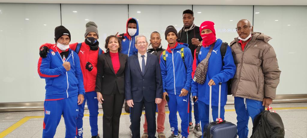 Astaná, 16 de diciembre de 2022. El Embajador de Cuba, Oscar Santana León, acompañado por la cónsul Neudys Casanova Mendoza, recibieron en el aeropuerto internacional “Nursultán Nazarbayev” a la escuadra de boxeo de Cuba que participará en el XXXVIII Torneo Internacional de Boxeo en memoria del Entrenador Emérito de la República Socialista Soviética de Kazajstán, Galym Zharylgapov, a celebrarse del 17 al 21 de diciembre en el Centro de Boxeo “Serik Sapiev” de Karagandá, ciudad kazaja situada a unos 220 km. de esta capital.