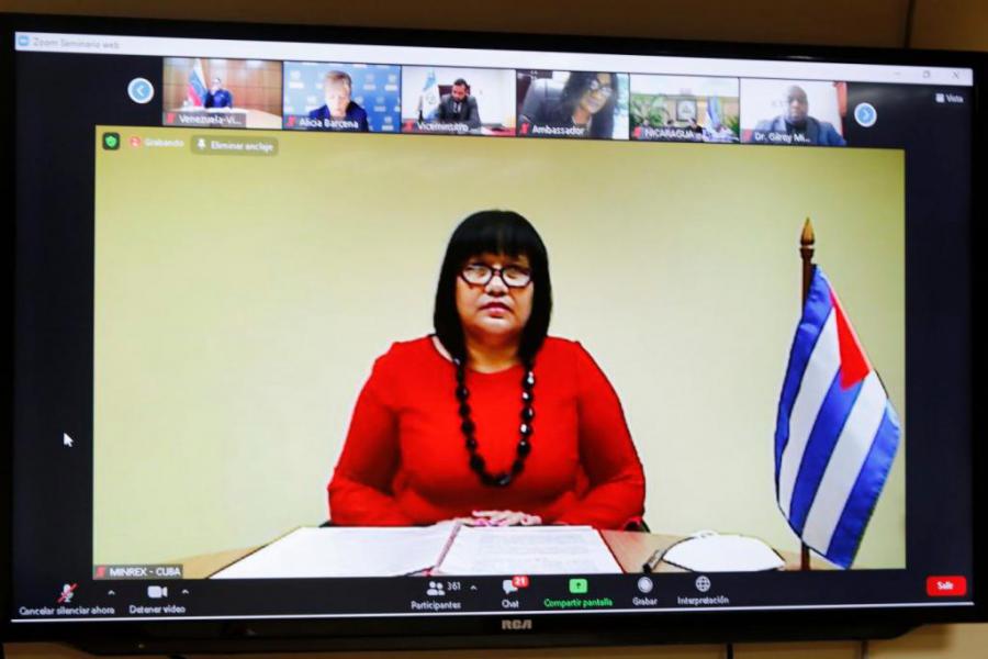 Me veo obligada a iniciar esta intervención denunciando que el bloqueo del gobierno de Estados Unidos contra Cuba impide a mi país acceder en igualdad de condiciones a la plataforma virtual utilizada para esta reunión.