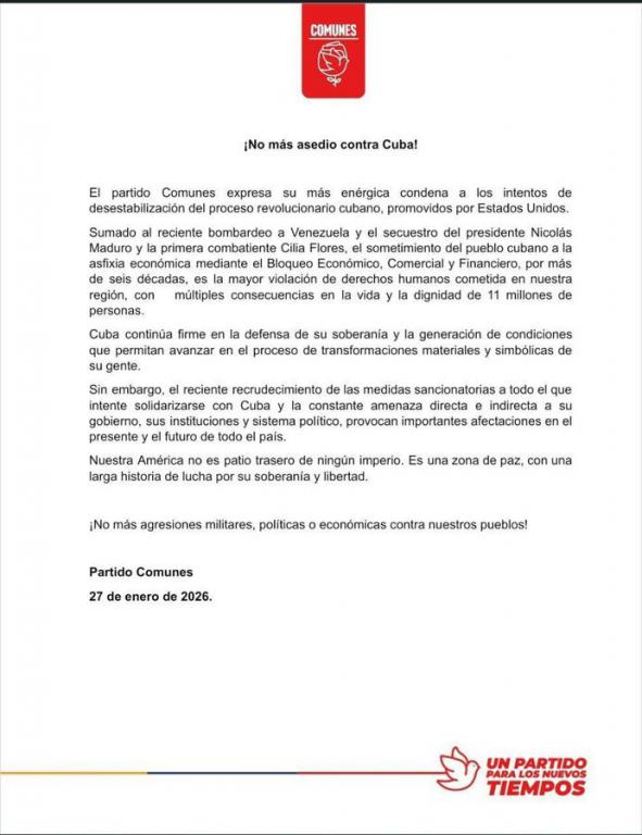 El Partido Comunes de Colombia emitió un comunicado el 27 de enero de 2026 en el que expresó su “más enérgica condena” a los intentos de desestabilización del proceso revolucionario cubano, que atribuye a acciones promovidas por Estados Unidos.
