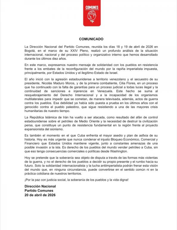 El Partido Comunes emitió un comunicado oficial tras la celebración de su XXIV Pleno, realizado los días 18 y 19 de abril de 2026 en Bogotá, en el que expone su análisis sobre la coyuntura internacional, nacional y su proceso organizativo interno durante la última década.