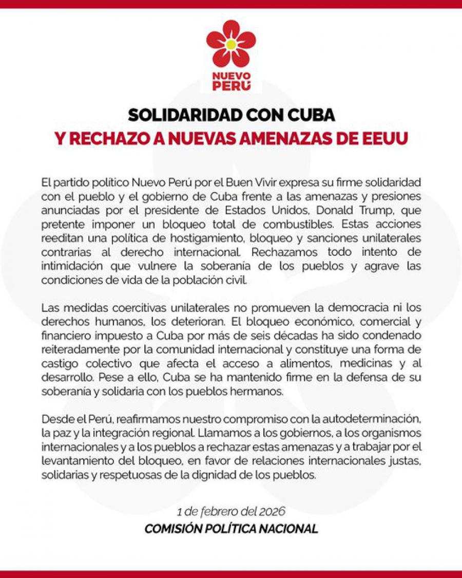 Lima, 2 de febrero. El Partido Político Nuevo Perú por el Buen Vivir expresó su firme solidaridad con el pueblo y Gobierno de Cuba frente a las amenazas y la criminal orden ejecutiva de Estados Unidos que pretende establecer un bloqueo total sobre las importaciones de combustible de la Isla para recrudecer la política de asfixia económica sobre nuestro país. En el comunicado, firmado por su Comisión Política Nacional, el partido Nuevo Perú manifiesta su "compromiso con la autodeterminación, la paz y la integración" y exhorta a los gobiernos, a los organismos internacionales y a los pueblos a rechazar estas amenazas y a trabajar por el levantamiento del bloqueo en favor de relaciones internacionales justas, solidarias y respetuosas de la dignidad de los pueblos.
