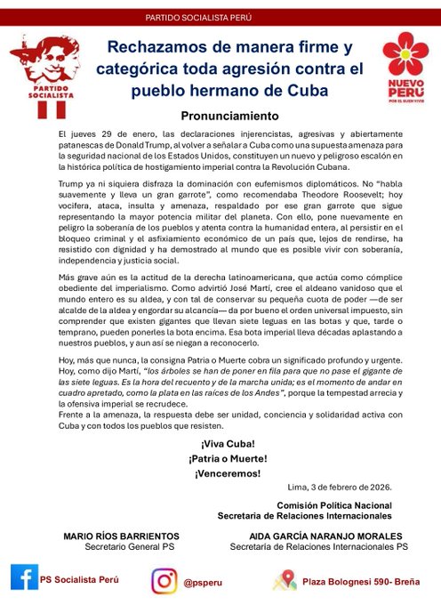 Lima, 5 de febrero: El Partido Socialista-Perú se pronuncia en rechazo a la orden ejecutiva criminal de Estados Unidos contra Cuba y se solidariza con el pueblo y gobierno cubanos.