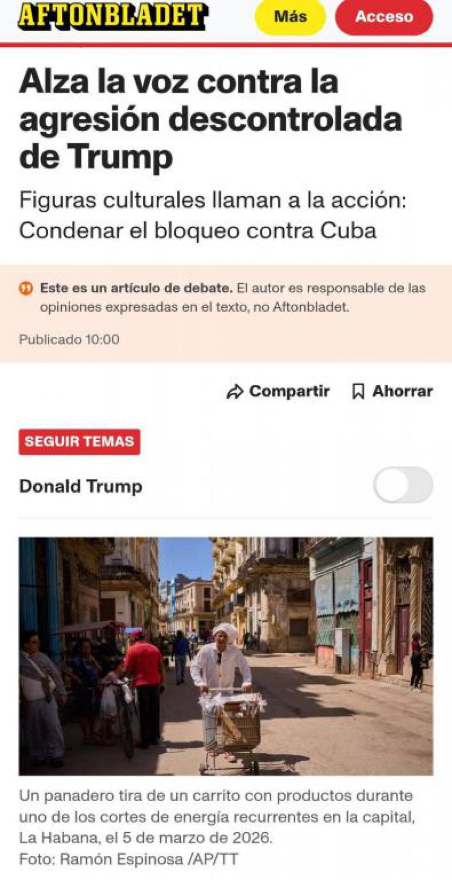 Periódico Aftonbladet se hace eco del rechazo de intelectuales, artistas y cubanos residentes en Suecia al recrudecimiento del bloqueo contra Cuba.