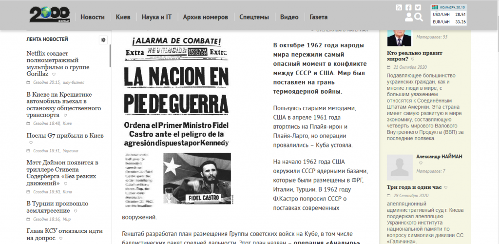 Kiev, 30 de octubre de 2020 – El periódico ucraniano “2000” publicó un artículo recordando el aniversario 58 del fin de la llamada “Crisis de los misiles” en Cuba.