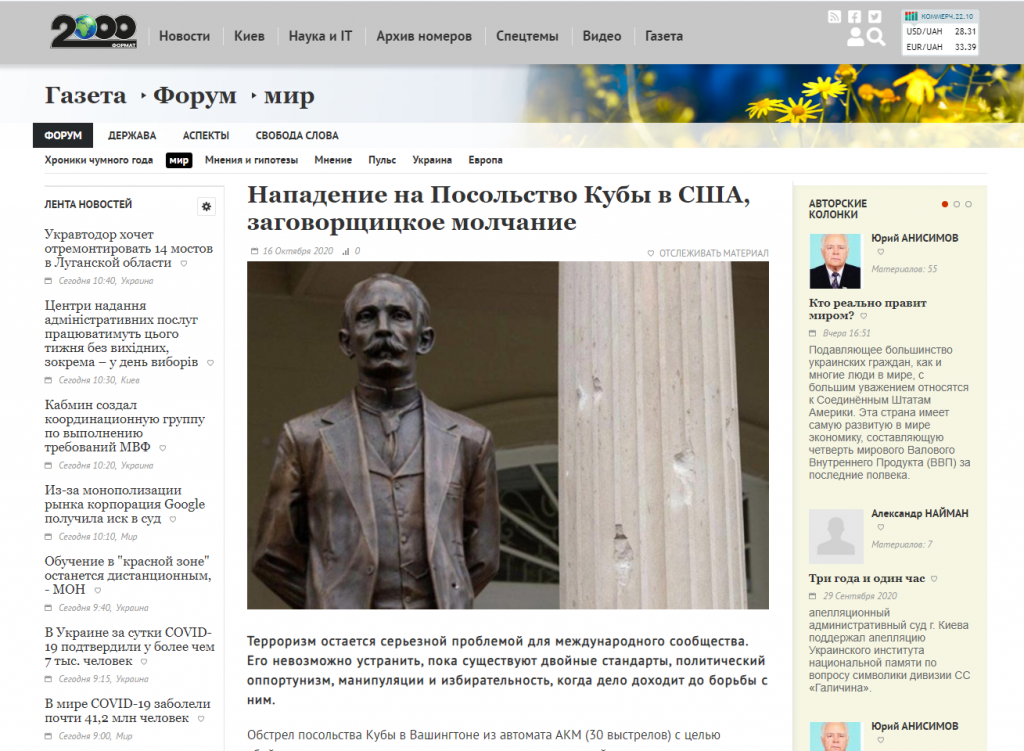 Kiev, 22 de octubre de 2020- El periódico ucraniano "2000" publicó un artículo titulado: "Atentado contra embajada de Cuba en EE.UU, el silencio cómplice"