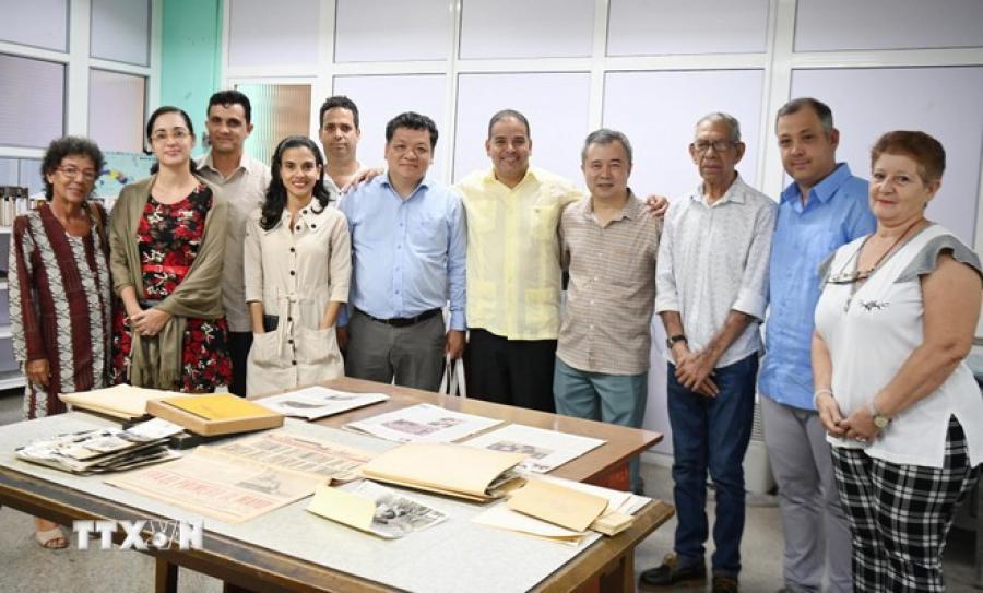 Yoerky Sánchez Cuellar presentó a la delegación de periodistas de Nhan Dan valiosos artículos, rollos originales y fotografías sobre el país y el pueblo de Vietnam durante la guerra de resistencia por la independencia, en particular la colección fotográfica sobre el presidente Ho Chi Minh y la edición histórica publicada el 1 de mayo de 1975 sobre la Victoria del 30 de abril.