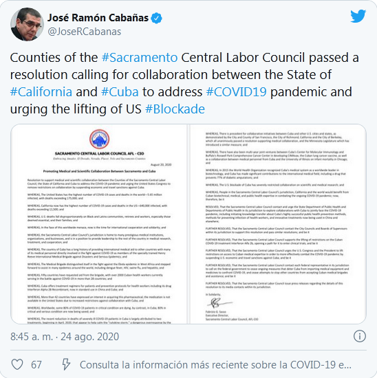De igual modo, se acuerda contactar a representantes federales para pedirle al gobierno norteamericano cesar las medidas en curso que impiden a Cuba importar equipos y medicamentos para enfrentar la COVID-19, y poner fin a los intentos de evitar que otros países acepten brigadas y asistencia de la isla. La organización californiana es uno de los casi 500 consejos laborales estatales y locales que forman parte de la AFL-CIO, la mayor federación de sindicatos de Estados Unidos.