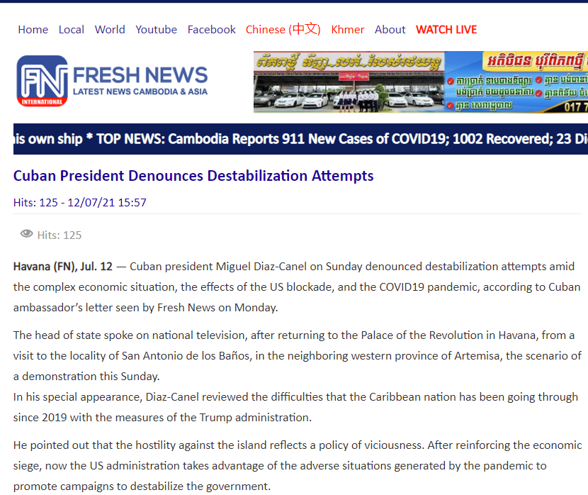 Fresh News, multimedia de mayor relevancia en Cambodia, continuó por segundo día consecutivo dando cobertura a los hechos acontecidos en Cuba, resultado de puesta en marcha de la maquinaria mediática conspirativa, articulada por el gobierno de Estados Unidos, y denuncida por la máxima dirección de la Isla.