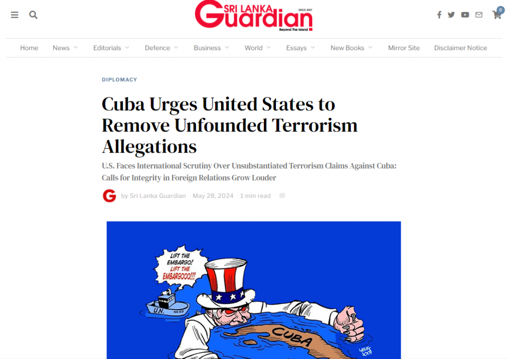 Colombo, 28 de mayo de 2024. El periódico digital ❝Sri Lanka Guardian❝ publica en portada un artículo en el que destaca que Cuba y muchos países del mundo se han sumado a un llamado a Estados Unidos para que retire a Cuba de la lista de países que supuestamente patrocinan el terrorismo.
