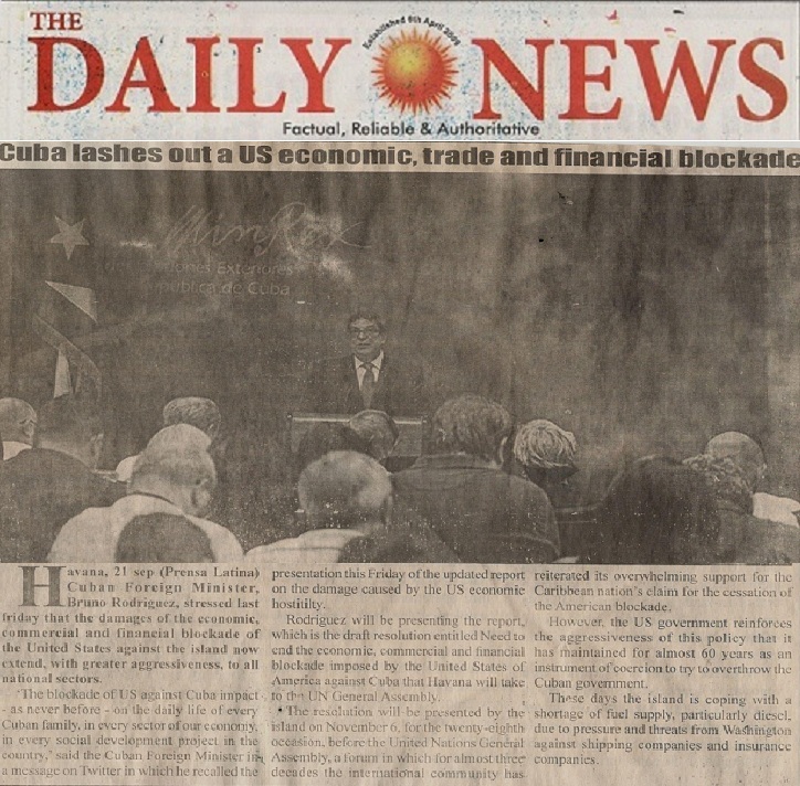 El diario Daily News reprodujo una información sobre la presentación por el ministro cubano de Relaciones Exteriores, Bruno Rodriguez, de un nuevo proyecto de Resolución de rechazo al cerco económico, comercial y financiero de Washington, que será debatido en noviembre venidero en la Asamblea General de la ONU.