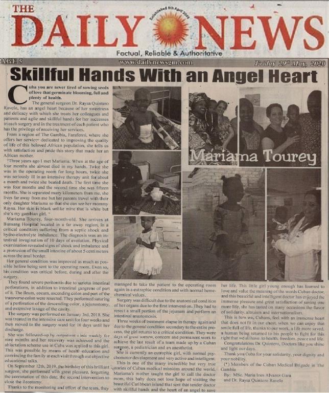 Bajo el título “Manos diestras con un corazón de ángel”, los cotidianos relatan en sus respectivas ediciones impresas cómo un equipo de salud de la mayor de las Antillas salvó la vida de una pequeña niña en la alejada región de Bansang, a más de 300 kilómetros de esta capital.