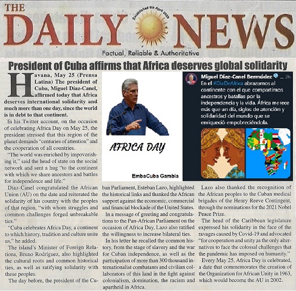 Banjul, 26 mayo. – La prensa gambiana se hizo eco hoy de varios mensajes de felicitación de las máximas autoridades cubanas por el Día de África, al tiempo ensalzar las muy positivas relaciones que existen entre el archipiélago caribeño y esta nación.