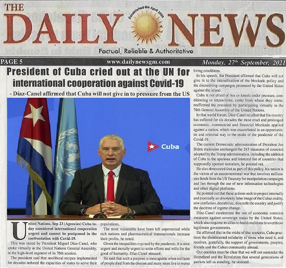 Banjul, 27 sept.- Los llamados del presidente cubano, Miguel Díaz-Canel, en la ONU a la cooperación internacional para enfrentar la pandemia de la Covid-19,y poner fin al bloqueo de EE.UU. contra su país, son destacados hoy por el diario gambiano Daily News.