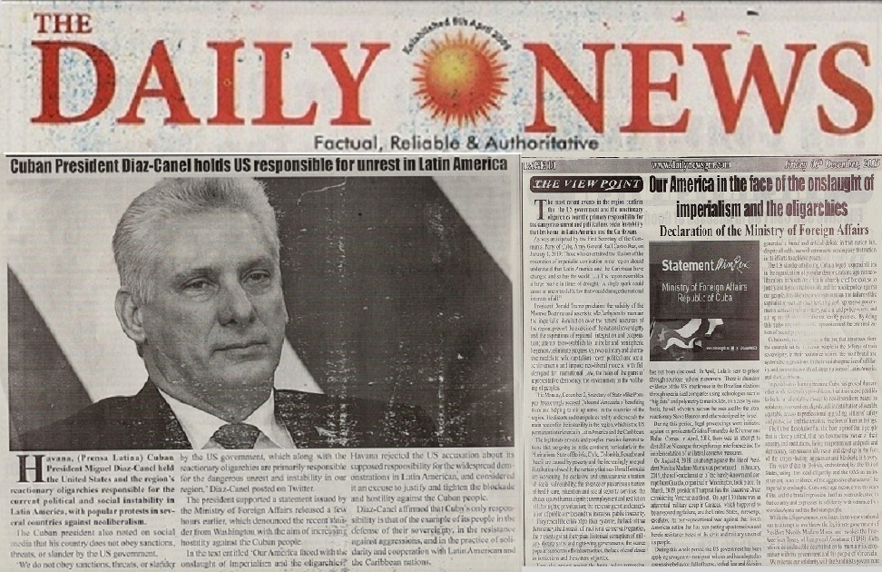Banjul, 6 dic.- El periódico gambiano Daily News se hizo eco hoy de una reciente denuncia del presidente cubano, Miguel Díaz-Canel, contra Estados Unidos, y reprodujo íntegramente una Declaración del Ministerio de Relaciones Exteriores de la Isla caribeña titulada “Nuestra América ante la arremetida del Imperialismo y de las oligarquías”.