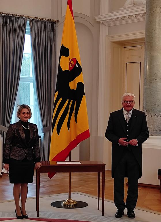 Berlín, 7 de abril de 2022. En la tarde de este jueves, en el Palacio de Bellevue, la embajadora Juana Martínez González entregó las Cartas Credenciales que la acreditan como Embajadora Extraordinaria y Plenipotenciaria de la República de Cuba al presidente de la República Federal de Alemania Frank-Walter Steinmeier.