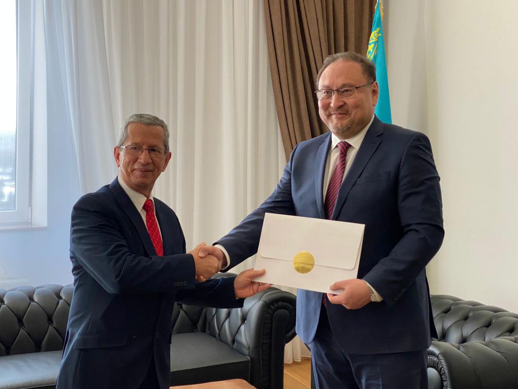 Nur-Sultán, 10 de marzo de 2022.- En la tarde de este jueves, en la sede del Ministerio de Asuntos Exteriores de Kazajstán, el embajador Oscar Santana León entregó al viceministro de Exteriores, Sr. Akan Rajmetullin, las Copias de Estilo de las Cartas Credenciales que le acreditan como Embajador Extraordinario y Plenipotenciario de la República de Cuba en la República de Kazajstán.
