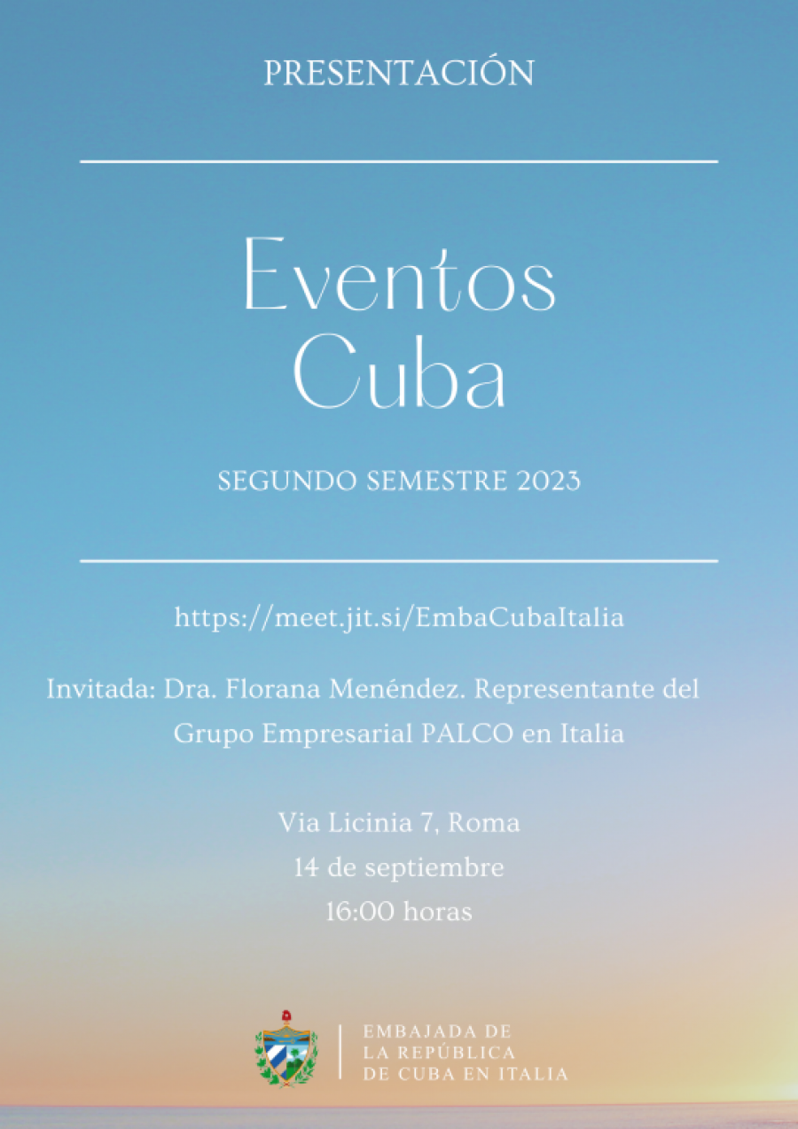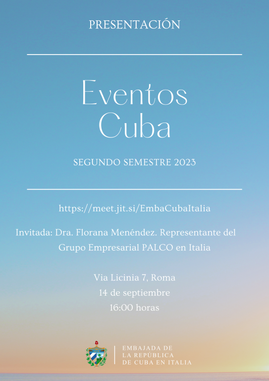 Roma, 14 de septiembre de 2023.- La Embajada de Cuba en Italia presentó los principales eventos internacionales que tendrán lugar en el segundo semestre del año, en la Isla. La iniciativa se enmarca en las actividades que desarrolla la misión diplomática para visibilizar y dar a conocer en este país los principales acontecimientos vinculados a los sectores del turismo, empresarial, cultura, educación, ciencia y salud, entre otros.