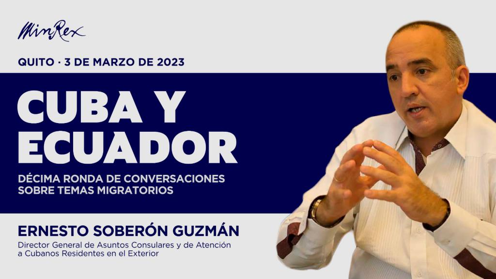 Quito, 28 febrero de 2023.- El director general de Asuntos Consulares y de Atención a Cubanos Residentes en el Exterior, Ernesto Soberón Guzmán, arribó este martes a Quito para participar en la Décima Ronda de Conversaciones sobre Temas Migratorios entre la República de Cuba y la República de Ecuador.