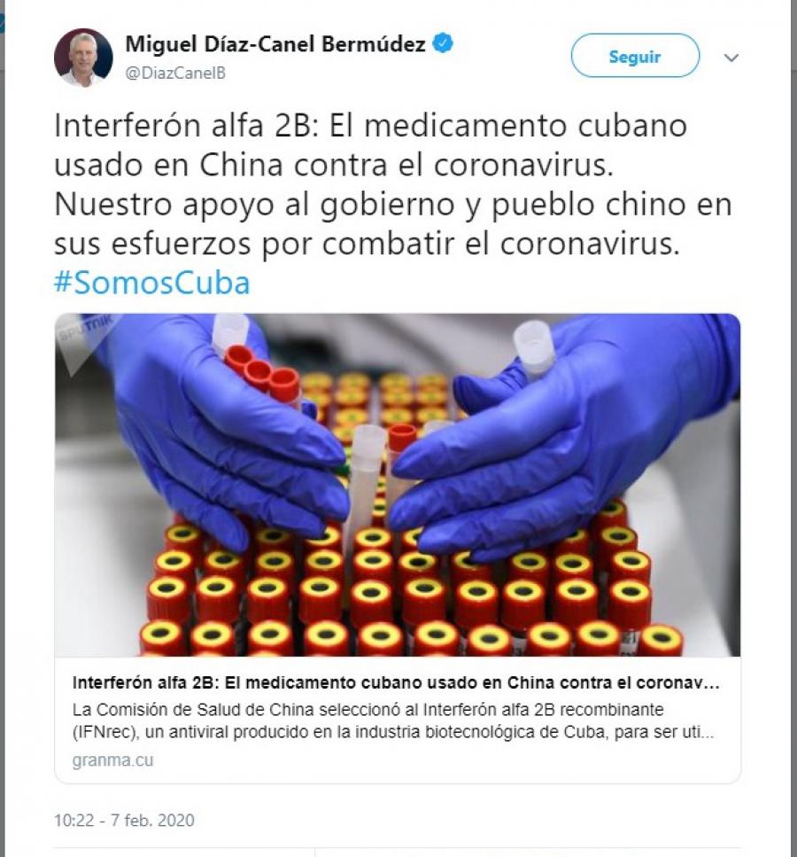 En su twitt el mandatario cubano también destacó al producto líder de la biotecnología cubana, el Interferón alfa 2B recombinante (IFNrec), como uno de los medicamentos usados por China en los tratamientos aplicados a enfermos de la epidemia coronavirus 2019-nCoV. Al respecto, el fármaco cubano es uno de los cerca de treinta escogidos por la Comisión Nacional de Salud china para tratar la afección respiratoria.