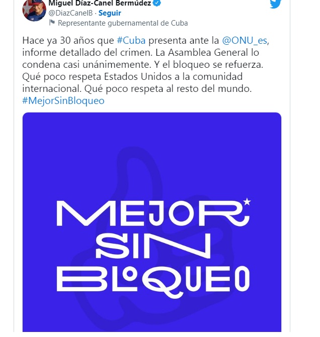 El Primer Secretario del Partido Comunista de Cuba y Presidente de la República, Miguel Díaz-Canel Bermúdez, denunció en Twitter que hace ya 30 años que Cuba presenta ante la ONU el informe detallado del crimen que constituye el bloqueo de EE.UU. hacia la isla.