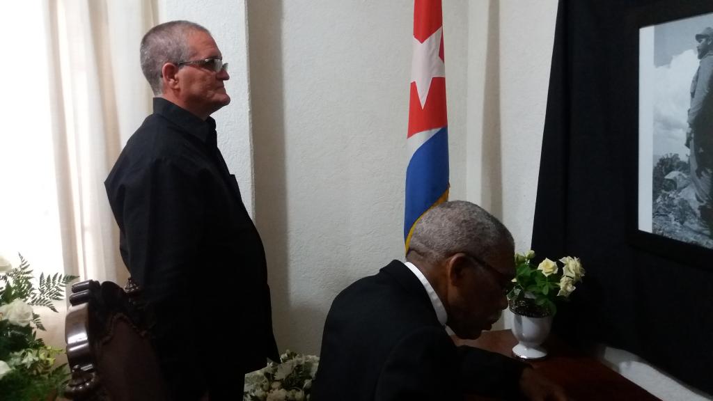 Presidente de la República Cooperativa de Guyana, Brigadier David Arthur Granger y Mrs. Sandra Granger a su llegada al país de regreso de Barbados directo del aeropuerto se dirigen a la sede de la Embajada de Cuba y firman el libro de condolencias por el fallecimiento del Líder de la Revolución Cubana, Fidel Castro.