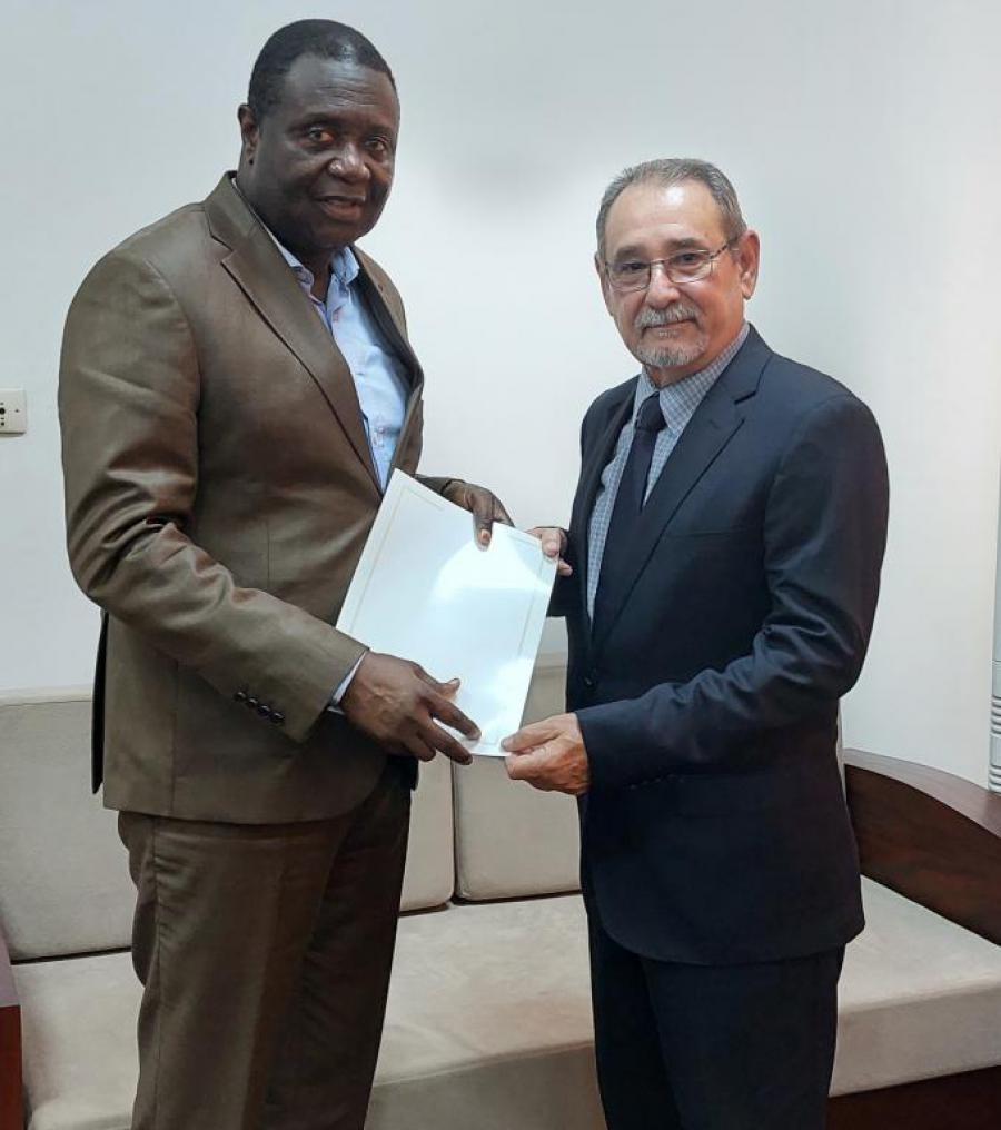 Cotonou, 15/02/2023.- El embajador cubano, Ricardo Garcia Napoles, fue recibido en audiencia por el excelentisimo presidente de la Corte Suprema de Benin, Sr. Victor Dassi. Garcia Napoles entregô una invitacion del Presidente del Tribunal Supremo Popular, Ruben Remigio Ferro a su homologo para participar en el XI Encuentro Internacional Justicia y Derecho 2024 a celebrarse en La Habana en el mes de mayo. En el año 2022 una delegacion integrada por André Vignon Sagbo Secretario General de la Corte Suprema y el Sr. Rodrigue Aboua, director de Documentación y Estudio participô en el X Encuentro Internacional de Justicia y Derecho y fue firmado un memorandum de cooperacion entre las instituciones de ambos paises. (CUBAMINREX/EMBACUBA BENIN)