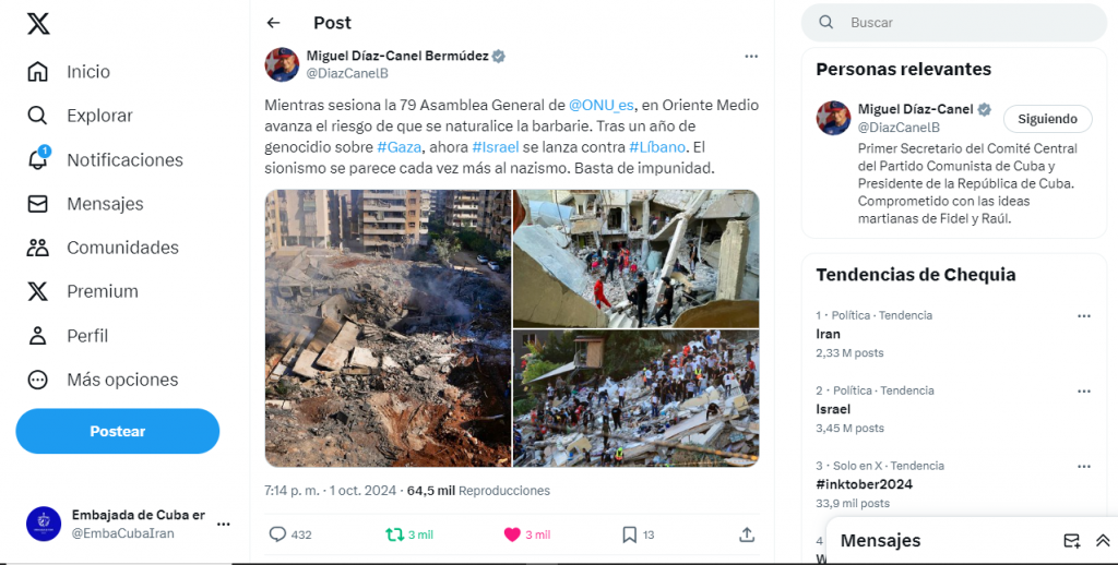 Teherán, 01 de octubre de 2024: El presidente de Cuba, Miguel Díaz Canel Bermúdez, denunció las acciones de Israel contra el Líbano en un mensaje publicado en su red social X (antes Twitter).