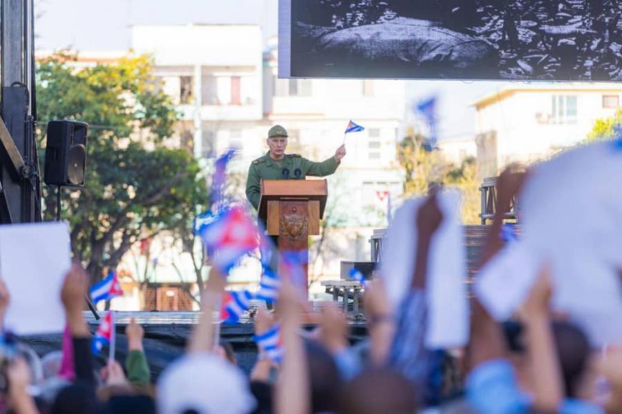 -Desde esta histórica tribuna, donde todavía resuenan las palabras de Fidel convocando al pueblo a buscar su sitio para el combate por venir, y donde hoy rendimos un merecido tributo y homenaje a los héroes y los mártires de aquel día en que la Patria vistió decidida el uniforme miliciano, convocamos a un movimiento nacional a internacional de solidaridad, que lleve a cada rincón del planeta la verdad de Cuba, el sufrimiento del pueblo por acciones del bloqueo, y guerra económicamente multidimensional, agravada por el bloqueo energético, lo que califica de genocidio por los niveles extremos de privaciones a los que estamos sometidos todas las cubanas y todos los cubanos.
