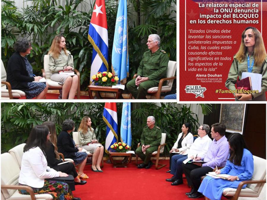 La Habana, Cuba. “La vida de todos los cubanos y las cubanas ha estado signada por el bloqueo", afirmó el presidente Miguel Díaz-Canel Bermúdez al recibir a Alena Douhan, Relatora Especial del Consejo de Derechos Humanos (CDH) de la Organización de las Naciones Unidas (ONU) sobre el impacto negativo de las medidas coercitivas unilaterales, quien efectuó una fructífera visita oficial a la Isla desde el 11 de noviembre, al término de la cual presentó en conferencia de prensa su informe preliminar, en cuyas conclusiones denuncia el impacto significativo del bloqueo en todos los aspectos de la vida de la población y exige su levantamiento al gobierno de los EEUU.