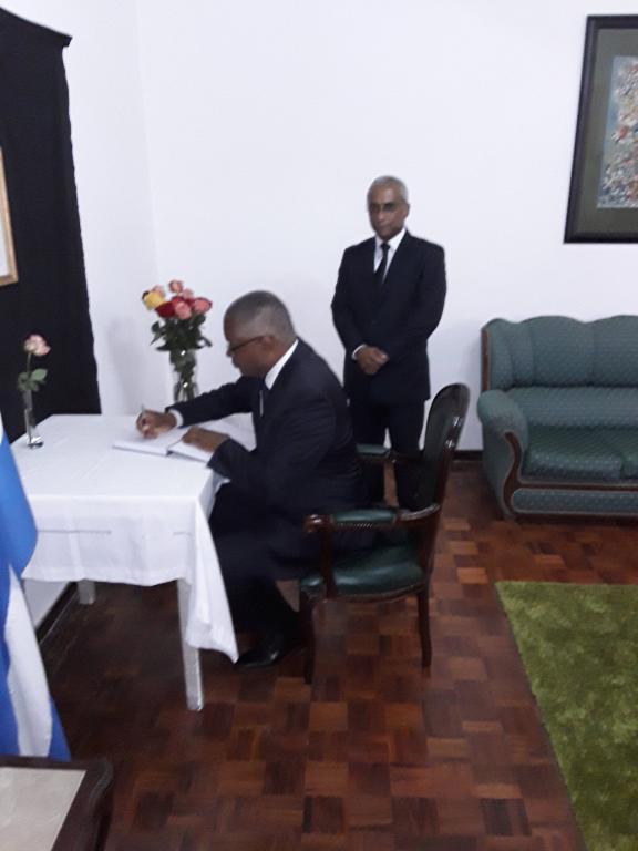 El Excmo. Sr. Jorge Mauricio dos Santos, Asamblea Nacional de la República de Cabo Verde (Parlamento) asistió a la Embajada de Cuba para firmar el libro de condolencias por el fallecimiento del Comandante en Jefe de la Revolución Cubana, así como expresar sus pésames y rendir homenaje al Comandante en Jefe.