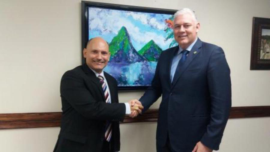 SANTA LUCIA, 4 de octubre de 2017.- El primer Ministro santalucense, Allen Chastanet, recibió en su oficina al embajador cubano en esa isla, Jorge Francisco Soberon Luis. Durante el encuentro se actualizó el estado de la cooperación entre los dos países.