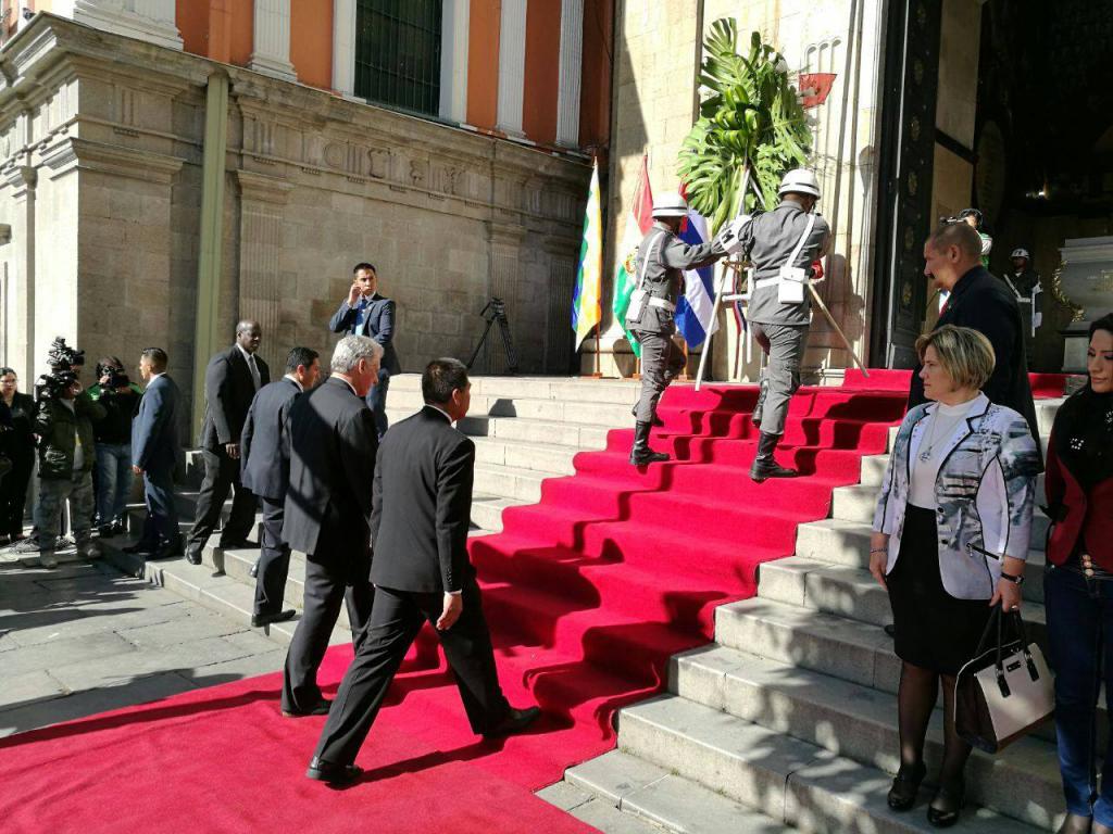 La Paz, Bolivia, 26 de mayo de 2017.- El primer vicepresidente de los Consejos de Estado y de Ministros de la República de Cuba, Miguel Díaz-Canel Bermúdez y la delegación que le acompaña, depositaron esta mañana una ofrenda floral ante los restos del Mariscal Andrés Santa Cruz y Calahumana, que descansan en la capilla de la Catedral Metropolitana Nuestra Señora de La Paz.