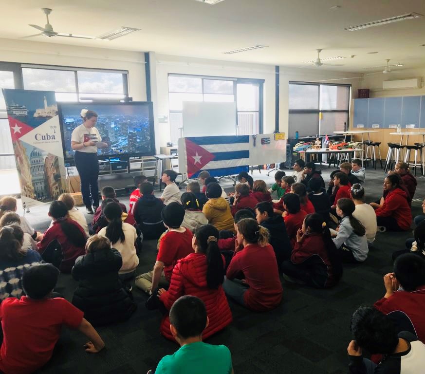 La embajada cubana, representada por Liuba Montano Rubio e Ivianes D. González Llanes, Primera y Tercera Secretarias, respectivamente, tuvo la oportunidad de llevar a los niños de quinto grado una clase teórica y práctica de ritmos cubanos.