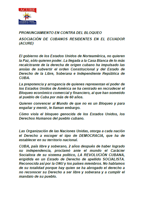 Oct272025 Quito, 27 de octubre de 2025. Compartimos el pronunciamiento de la Asociación de Cubanos Residentes en Ecuador (ACURE) Amor con amor se paga. José Martí. EmbaCuba-Ecuador Etiquetas: #TumbaElBloqueo #Siempre con CubaCategoría: BloqueoComunidad cubanaRelaciones BilateralesSolidaridadRSS Minrex: