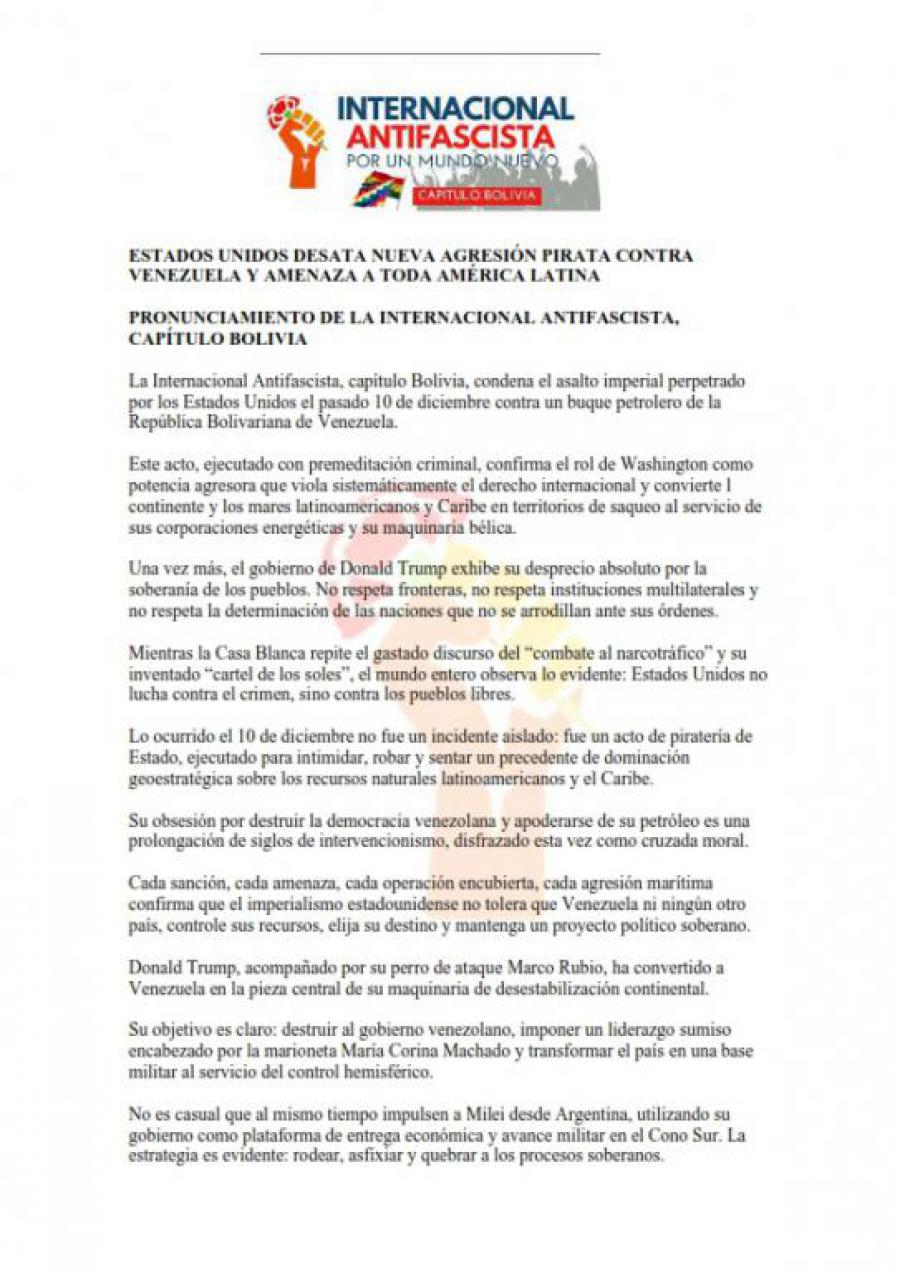 La Internacional Antifascista, capítulo Bolivia, condena el asalto imperial perpetrado por los Estados Unidos el pasado 10 de diciembre contra un buque petrolero de la República Bolivariana de Venezuela.