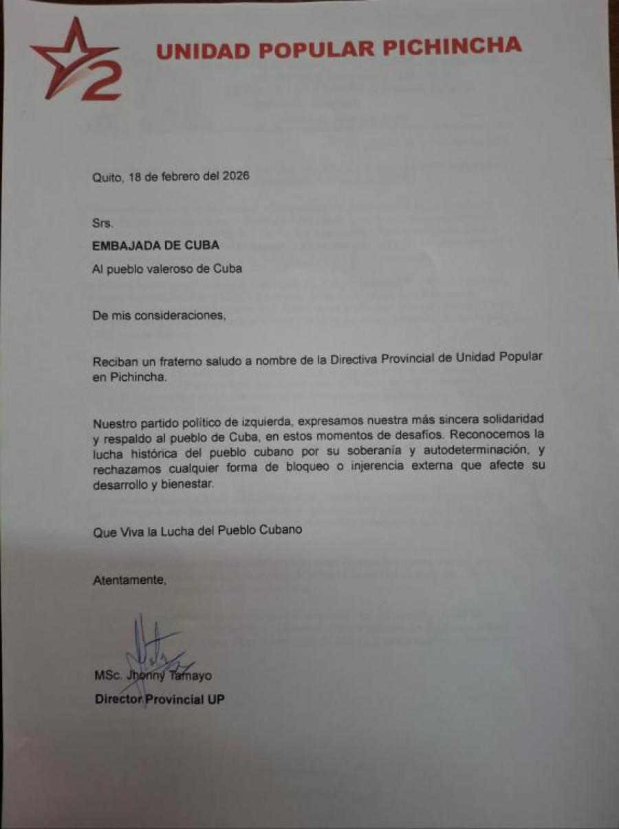 Quito, 18 de febrero de 2026. Pronunciamiento de solidaridad de la Directiva de la Unidad Popular en Pichincha, expresando su apoyo al pueblo de Cuba en rechazo a las medidas coercitivas impuestas por el gobierno de los Estados Unidos a Cuba. Jhonny Tamayo, director de Unidad Popular en Pichincha, reconoció la lucha histórica del pueblo cubano por su soberanía y autodeterminación, al tiempo que rechazó el Bloqueo y la injerencia externa de EE.UU.