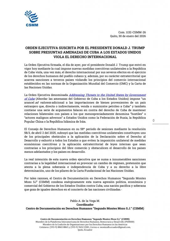 Quito, 30 de enero de 2026. Pronunciamiento del Centro de documentación en derechos humanos "Segundo Montes Mozo S:J", condena enérgicamente nueva agresión politica, económica y comercial del Gobierno de los Estados Unidos contra Cuba.