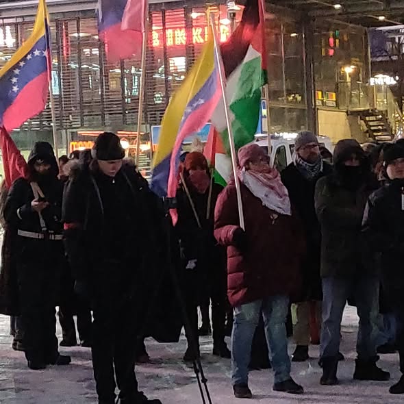 Ene062026 Banderas venezolanas ondeando en una protesta antiimperialista en Narinkkatori.Hubo muchos oradores preocupados en el micrófono abierto, y hay motivos para estar preocupados.Categoría: SolidaridadRSS Minrex:
